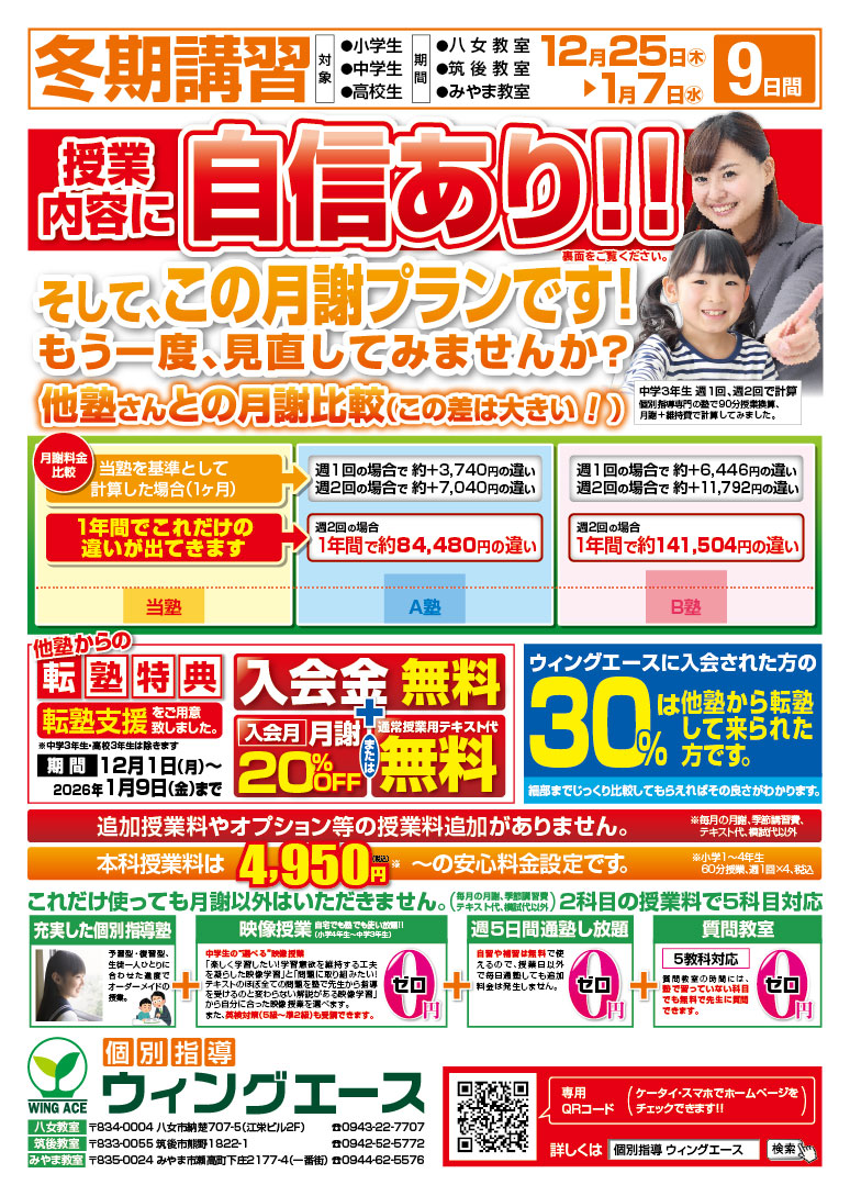 八女市・筑後市・みやま市の塾、個別指導ウィングエース。小学生・中学生・高校生を安心料金で指導します。